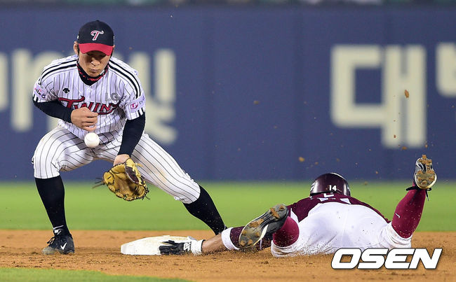 15일 오후 서울 잠실구장에서 열린 '2014 한국야쿠르트 세븐 프로야구' LG 트윈스와 넥센 히어로즈의 경기 3회초 2사 1루 서동욱 타석, 1루주자 서건창이 도루에 성공하고 있다.