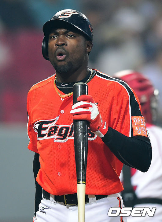 3회초 무사 한화 피에가 삼진을 당한 뒤 놀란 표정을 지으며 더그아웃으로 들어오고 있다.