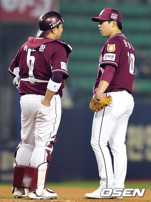 15일 오후 서울 잠실구장에서 열린 '2014 한국야쿠르트 세븐 프로야구' LG 트윈스와 넥센 히어로즈의 경기 4회말 1사 정의윤에게 솔로포를 허용한 문성현이 허도환과 이야기를 나누고 있다.