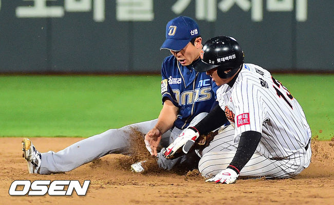 5회말 2사 주자 1루 롯데 문규현 타석에서 1루 주자 황재균이 2루 도루 성공하고 있다.