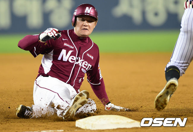 15일 오후 서울 잠실구장에서 열린 '2014 한국야쿠르트 세븐 프로야구' LG 트윈스와 넥센 히어로즈의 경기 5회초 1사 1루 문우람의 중견수 플라이볼에 2루를 지나 3루로 쇄도하던 1루주자 이성열이 1루로 돌아오며 슬라이딩 하고 있다.