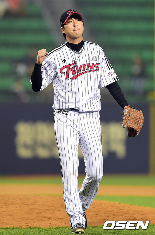 15일 오후 서울 잠실구장에서 열린 '2014 한국야쿠르트 세븐 프로야구' LG 트윈스와 넥센 히어로즈의 경기 5회초 2사 1루 허도환을 삼진으로 처리한 우규민이 기뻐하고 있다.