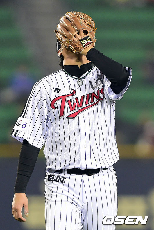 15일 오후 서울 잠실구장에서 열린 '2014 한국야쿠르트 세븐 프로야구' LG 트윈스와 넥센 히어로즈의 경기 6회초 2사 1루 강정호를 내야땅볼로 처리한 우규민이 덕아웃으로 향하며 글러브로 얼굴을 가리고 있다.