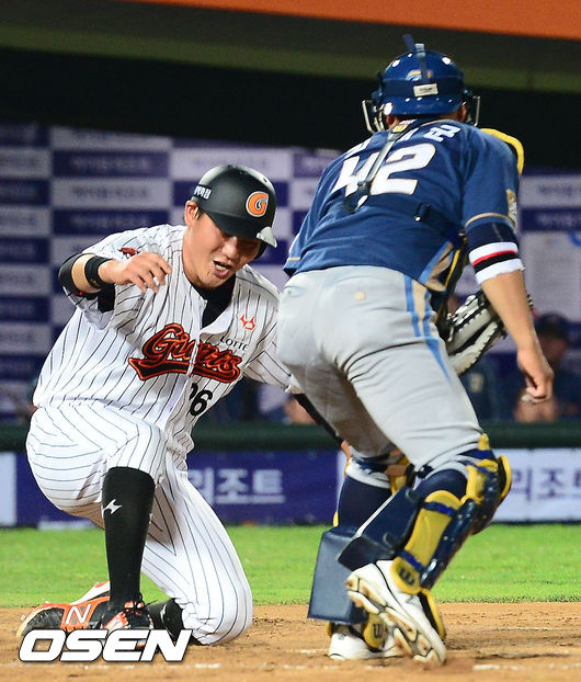 7회말 2사 만루 롯데 전준우 3타점 싹쓸이 적시타때 1루 주자 장성우가 홈으로 몸을 던지며 세이프 되고 있다.