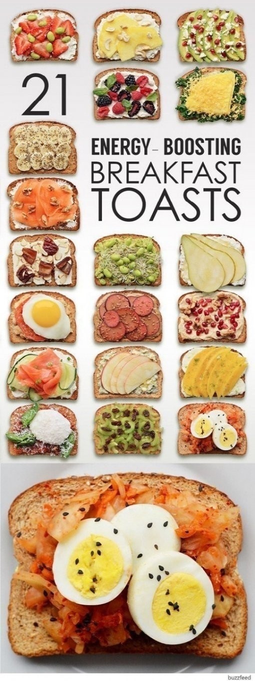 사진에는 아침에 에너지를 북돋아 줄 수 있는 토스트 레시피 21가지가 나와있다.