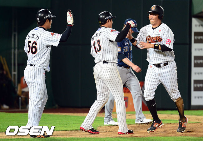 7회말 2사 만루 롯데 전준우의 3타점 싹쓸이 적시타때 홈을 밟은 신본기 황재균이 장성우가 기쁨의 하이파이브를 나누고 있다.