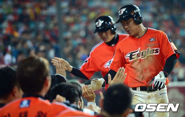7회초 2사 만루 한화 정근우와 이희근이 피에의 안타로 득점을 올린 뒤 동료들과 기뻐하고 있다.