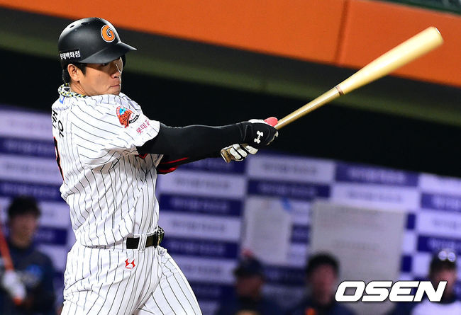 7회말 2사 만루 롯데 전준우가 3타점 싹쓸이 적시타를 날리고 있다.