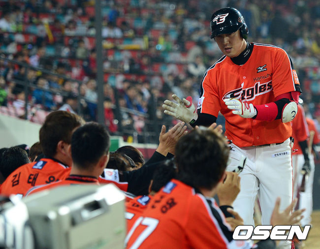 8회초 1사 한화 김회성이 솔로 홈런을 때린 뒤 동료들과 기뻐하고 있다.