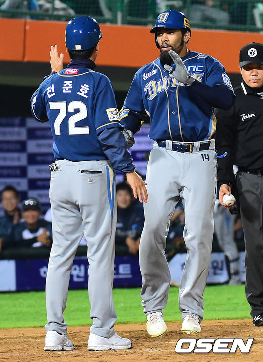 9회초 2사 주자 없는 상황에서 우월 동점 솔로 홈런을 날린 테임즈가 홈을 밟고 있다.