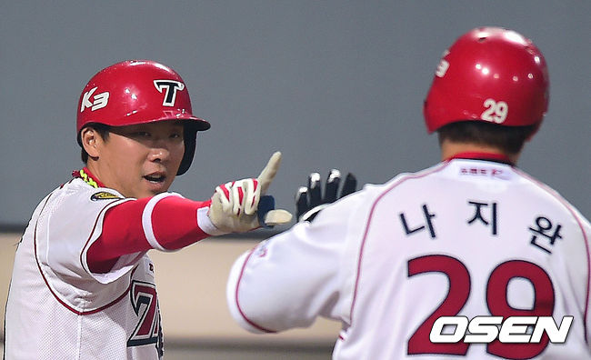 8회말 1사 1루 KIA 나지완이 투런 홈런을 때린 뒤 안치홍에게 축하받고 있다.