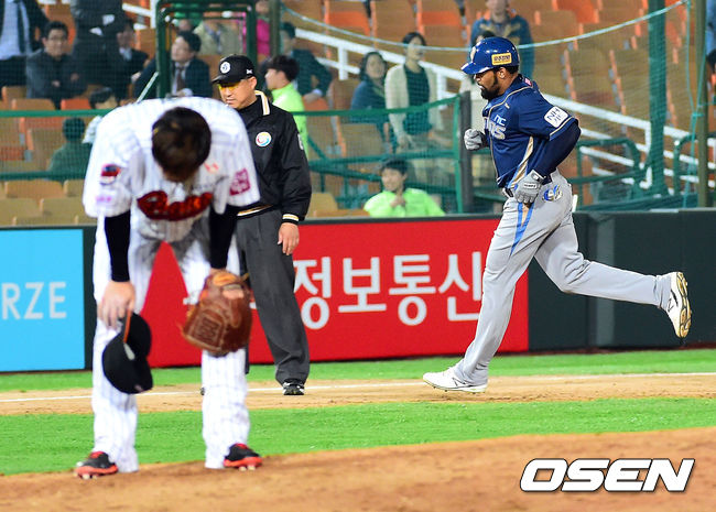 9회초 2사 주자 없는 상황에서 대타로 나온 NC 테임즈가 우월 동점 솔로 홈런을 날린 후 그라운드를 돌고 있을때 롯데 김성배 투수가 고개를 떨구고 있다.