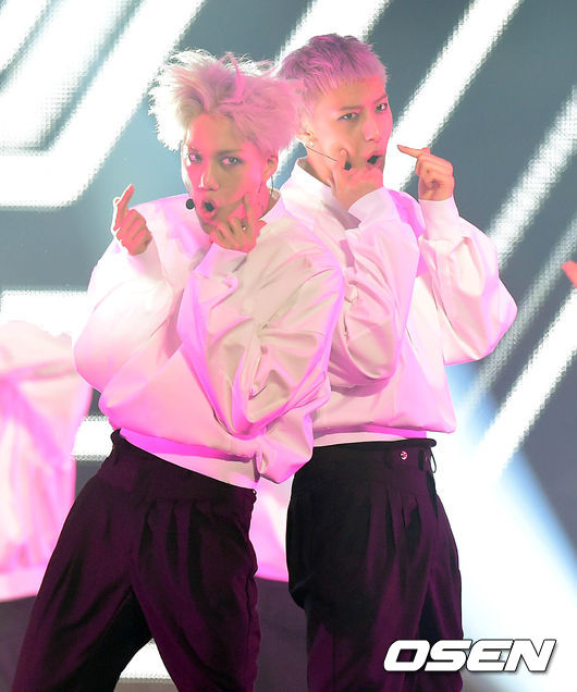 그룹 엑소 카이와 타오가 화려한 공연을 펼치고 있다.