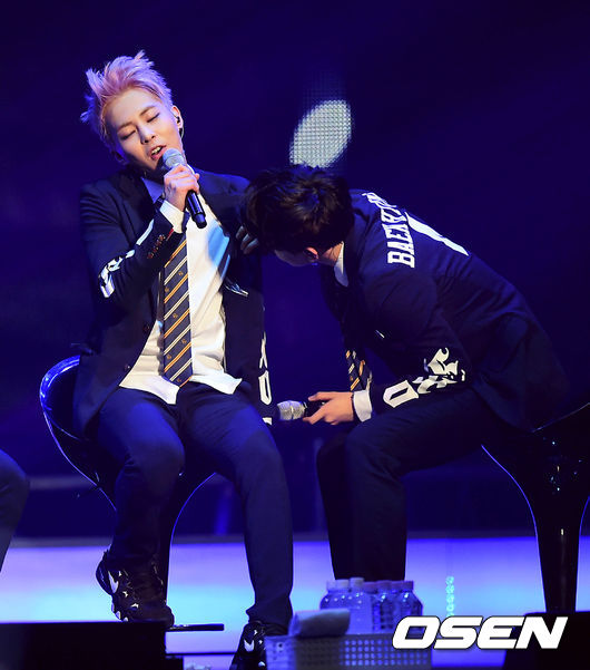 그룹 엑소 시우민이 노래를 부를 때 백현이 장난을 치고 있다.