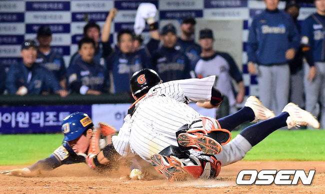 10회초 2사 1,2루 NC 나성범의 우익수 앞 안타때 롯데 우익수 손아섭이 홈으로 송구, 3루주자 박민우가 롯데 포수 장성우에게 태그 아웃되고 있다.