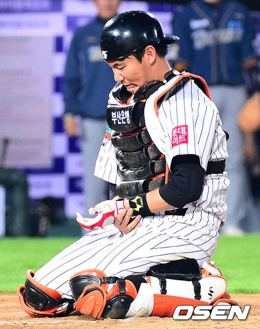 10회초 2사 1,2루 나성범의 우익수 앞 안타때 롯데 우익수 손아섭이 홈으로 송구, 3루주자 박민우를 태그 아웃 시킨 롯데 포수 장성우가 손목 충돌로 아파하고 있다.