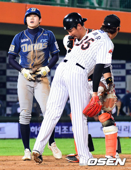 10회초 2사 1,2루 NC 나성범의 우익수 앞 안타때 롯데 우익수 손아섭이 홈으로 송구, 롯데 포수 장성우에게 태그아웃 당한 3루주자 박민우가 아쉬워 하고 있다.