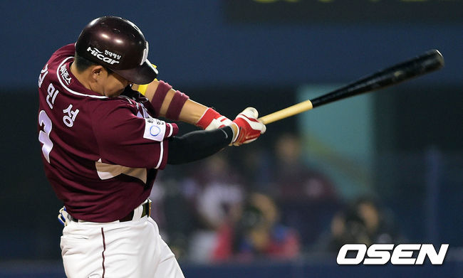 15일 오후 서울 잠실구장에서 열린 '2014 한국야쿠르트 세븐 프로야구' LG 트윈스와 넥센 히어로즈의 경기 11회초 무사 2루 김민성이 1타점 적시타를 치고 있다.