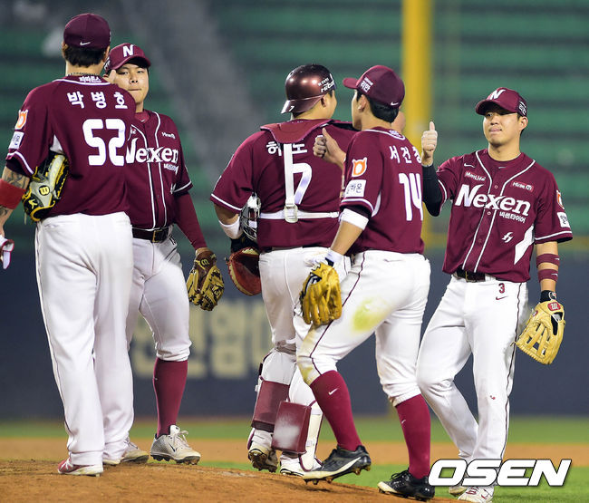 15일 오후 서울 잠실구장에서 열린 '2014 한국야쿠르트 세븐 프로야구' LG 트윈스와 넥센 히어로즈의 경기 종료 후 넥센 선수들이 하이파이브를 하고 있다.