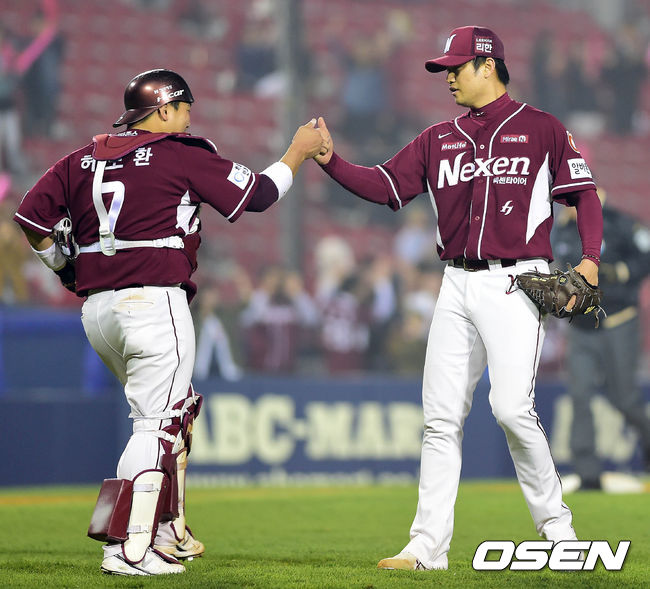 15일 오후 서울 잠실구장에서 열린 '2014 한국야쿠르트 세븐 프로야구' LG 트윈스와 넥센 히어로즈의 경기 종료 후 허도환과 손승락이 하이파이브를 하고 있다.