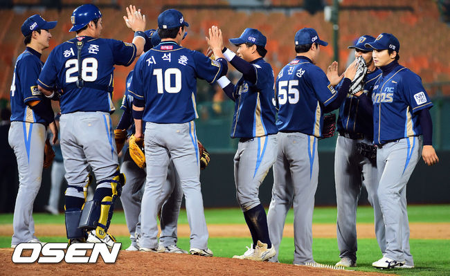 경기종료, 승리한 NC선수들이 기쁨의 하이파이브를 나누고 있다. /ouxou@osen.co.kr