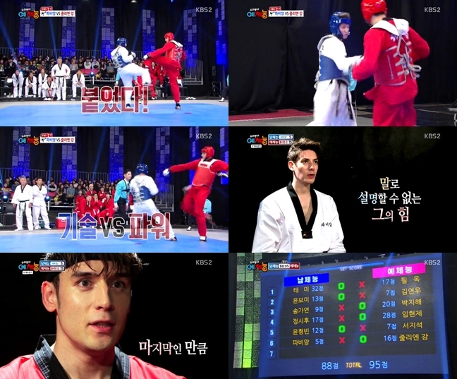15일 오후 방송된 KBS 2TV '우리동네 예체능'에는 예체능 팀(강호동, 김연우, 서지석, 줄리엔 강, 존 박, 호야, 필독, 박지해, 김종겸, 김나현, 임현제)과 남체능 팀(이동준, 석주일, 파비앙, 윤형빈, 윤보미, 태미, 정시후)의 자존심을 건 태권도 한 판 대결이 펼쳐졌다.