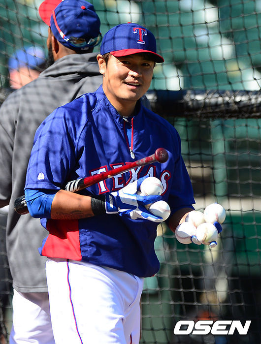 경기에 앞서 텍사스 추신수가 타격 훈련을 마치고 미소짓고 있다.