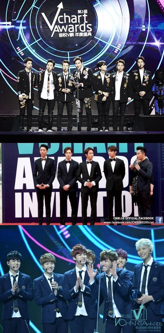 슈퍼주니어-M, 엑소, 슈퍼주니어, 씨엔블루, 방탄소년단은 지난 15일 오후 7시(현지시간)에 중국 베이징 마스터카스 센터에서 열린 '인위에 V차트 어워즈'에서 각각 올해의 앨범상과 최고 인기가수상, 최우수 밴드상, 신인상 등을 받았다.