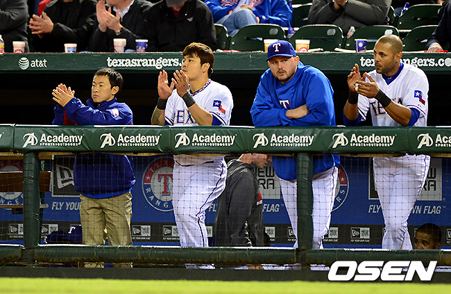 8회말 2사 2루에서 텍사스 모어랜드의 적시타에 추신수가 더그아웃에서 박수를 치며 기뻐하고 있다./jpnews@osen.co.kr