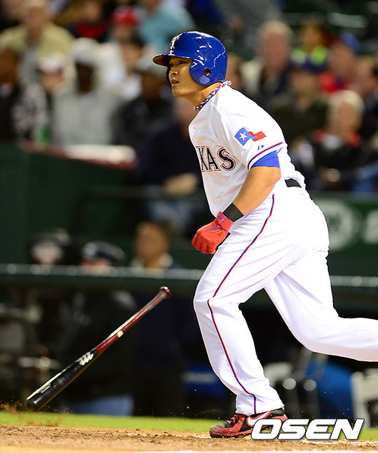 8회말 무사에서 텍사스 추신수가 좌익수 플라이를 날리고 타구를 바라보고 있다./jpnews@osen.co.kr