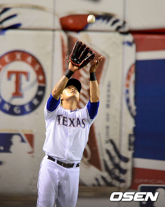 8회초 2사 1,2루에서 텍사스 추신수가 시애틀 애클리의 좌익수 플라이 타구를 처리하고 있다./jpnews@osen.co.kr