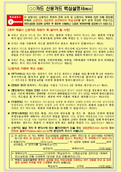 이에 금감원은 신용카드 발급 신청시 신용카드 회원으로서 꼭 알아야 할 사항에 대한 소비자의 이해를 돕는 한편, 설명의무 불이행과 관련한 민원이 발생하지 않도록 하기 위해 금감원 내 '소비자보호심의위원회' 심의를 거쳐 '신용카드 핵심설명서' 제도를 도입하고 그 시행방안을 마련했다.
