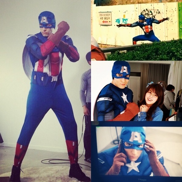 이날 공개된 사진 속 줄리엔 강은 케이블 채널 tvN 시트콤 ‘감자별 2013QR3’ 촬영을 위해 캡틴 아메리카로 변신한 채 다양한 포즈를 취하고 있다.