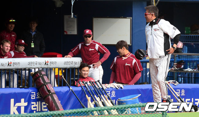 16일 오후 서울 잠실구장에서 열리는 '2014 한국야쿠르트 세븐 프로야구' LG 트윈스와 넥센 히어로즈의 경기 시작전 김기태 감독이 넥센 선수들이 있는 덕아웃을 바라보며 미소를 짓고 있다.