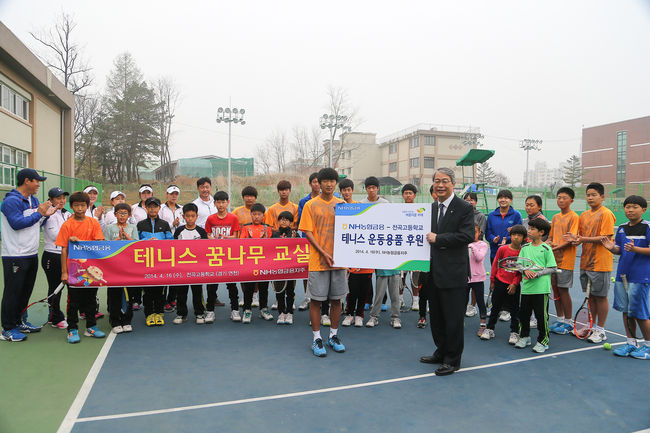 한편, 임종룡 회장(NH농협금융지주)은 NH농협은행팀이 학생들을 대상으로 원 포인트 레슨을 하고 있는 현장을 직접 찾아 “꿈과 희망을 가지고 목표를 세워 매일매일 꾸준히 실천하라”고 당부 하면서 행사에 참여한 전곡 초중고등학교 테니스 선수들에게 테니스용품을 전달했다.