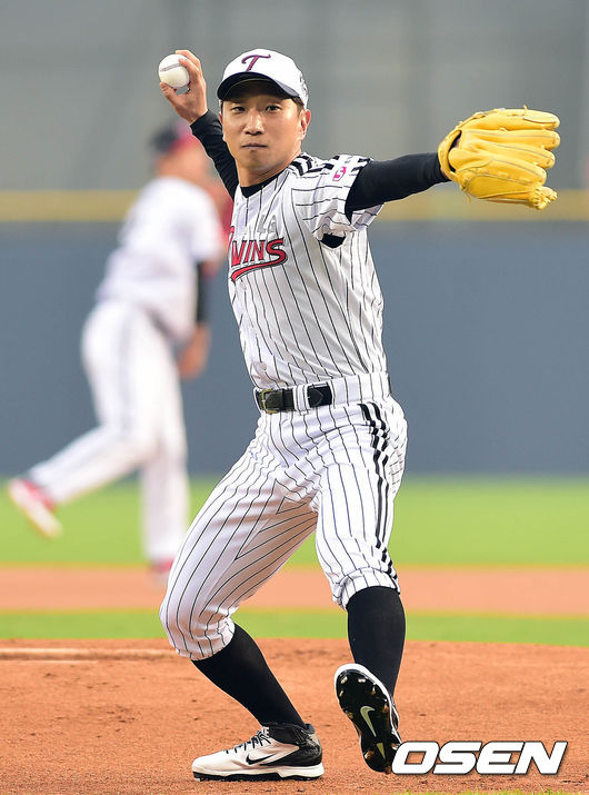 16일 오후 서울 잠실구장에서 열린 '2014 한국야쿠르트 세븐 프로야구' LG 트윈스와 넥센 히어로즈의 경기 시작전 스피드 스케이팅 국가대표 이규혁이 시구를 하고 있다.