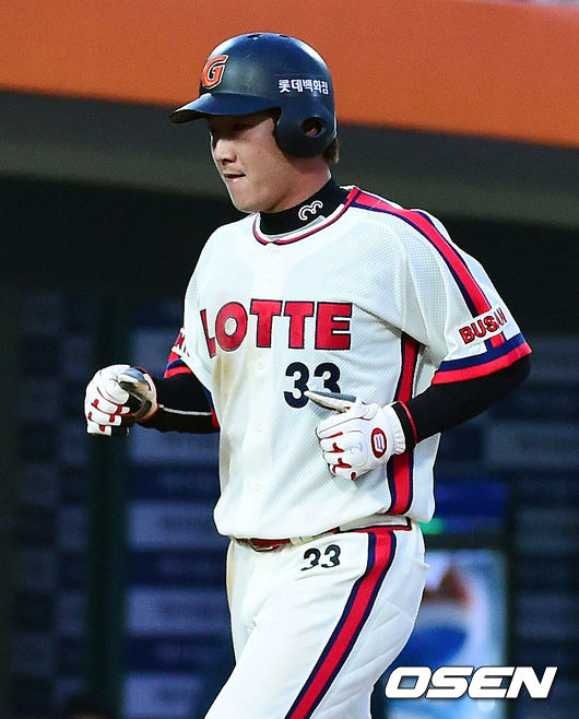 1회말 무사 1,2루 손아섭 선취 1타점 적시타때 2루 주자 정훈이 홈을 밟고 있다.