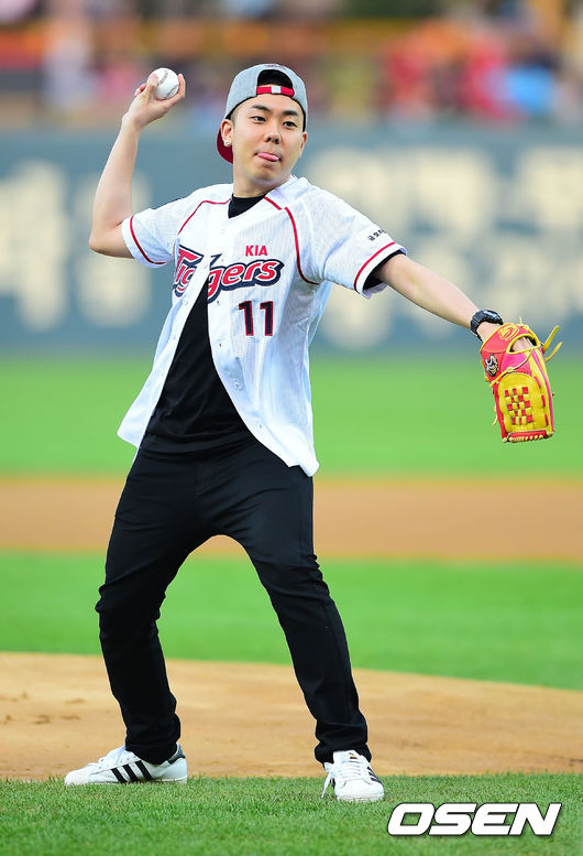 경기에 앞서 가수 로꼬가 시구를 하고 있다.