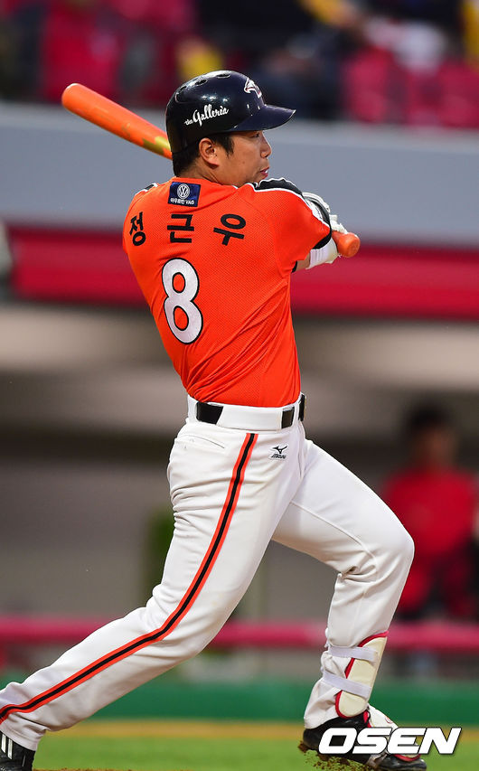 2회초 2사 3루 한화 정근우가 1타점 3루타를 때리고 있다.