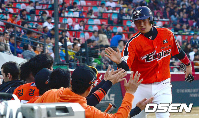 2회초 2사 3루 한화 이희근이 정근우의 안타로 득점을 올린 뒤 동료들과 기뻐하고 있다.