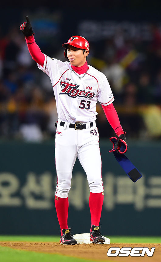2회말 2사 1,2루 KIA 이대형이 2타점 적시타를 때린 뒤 기뻐하고 있다.