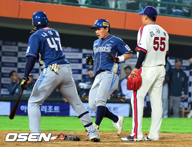 3회초 무사 1,2루 나성범 타석때 롯데 포수 장성우 포일로 2루 주자 이종욱이 3루를 돌아 홈을 밟고 있다.