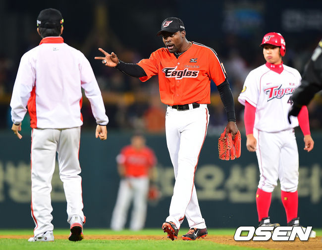 4회말 한화 피에가 수비도중 마운드에 있는 클레이를 진정시키기 위해 2루까지 달려나와 이야기를 하고 있다.