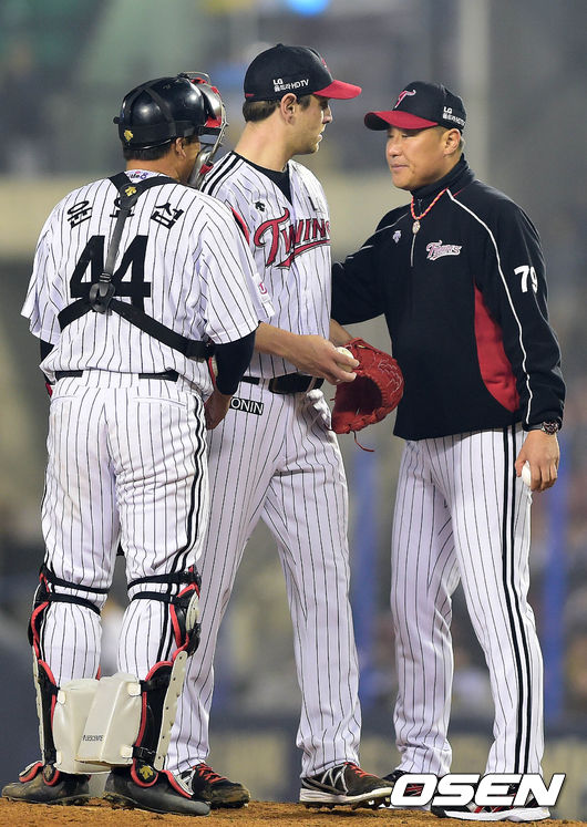 16일 오후 서울 잠실구장에서 열린 '2014 한국야쿠르트 세븐 프로야구' LG 트윈스와 넥센 히어로즈의 경기 7회초 2사 2루 강정호 타석, 리오단이 마운드를 내려가고 있다. 김선규로 교체.