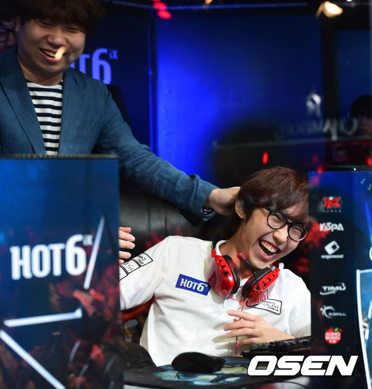 16일 오후 서울 용산 e스포츠센터에서 진행된 '핫식스 LOL 챔피언스(이하 롤챔스)' 8강 SK텔레콤 K와 삼성 오존의 경기, 1세트 승리를 거둔 삼성 오존 구승빈이 미소 짓고 있다.