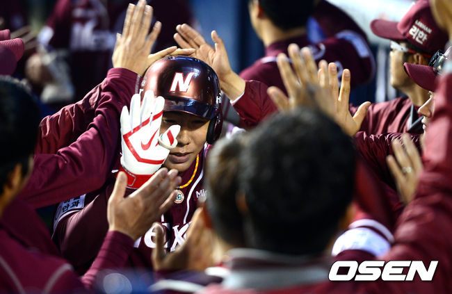 16일 오후 서울 잠실구장에서 열린 '2014 한국야쿠르트 세븐 프로야구' LG 트윈스와 넥센 히어로즈의 경기 7회초 2사 2루 강정호가 투런포를 치고 덕아웃에서 동료들과 하이파이브를 하고 있다.