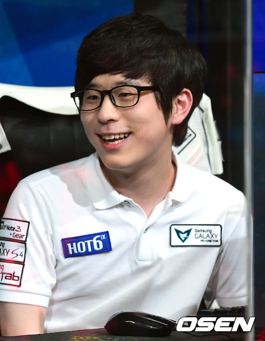 16일 오후 서울 용산 e스포츠센터에서 진행된 '핫식스 LOL 챔피언스(이하 롤챔스)' 8강 SK텔레콤 K와 삼성 오존의 경기, 1세트 승리를 거둔 삼성 오존 장형석이 미소 짓고 있다.
