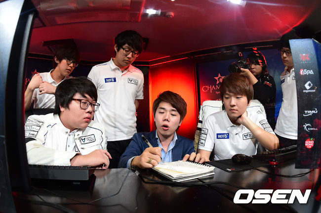 16일 오후 서울 용산 e스포츠센터에서 진행된 '핫식스 LOL 챔피언스(이하 롤챔스)' 8강 SK텔레콤 K와 삼성 오존의 경기, 1세트 승리를 거둔 삼성 오존 윤성영 코치가 선수들에게 작전 지시하고 있다.