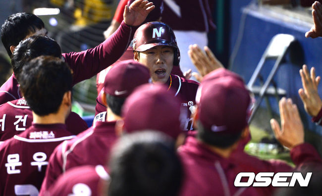 16일 오후 서울 잠실구장에서 열린 '2014 한국야쿠르트 세븐 프로야구' LG 트윈스와 넥센 히어로즈의 경기 7회초 2사 2루 강정호가 투런포를 치고 덕아웃에서 동료들과 하이파이브를 하고 있다.