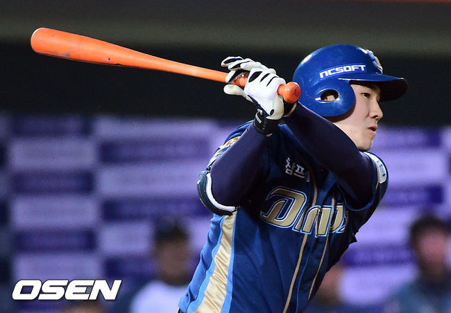 6회초 2사 2루 박민우의 우익수 앞 1타점 적시타를 날리고 있다.